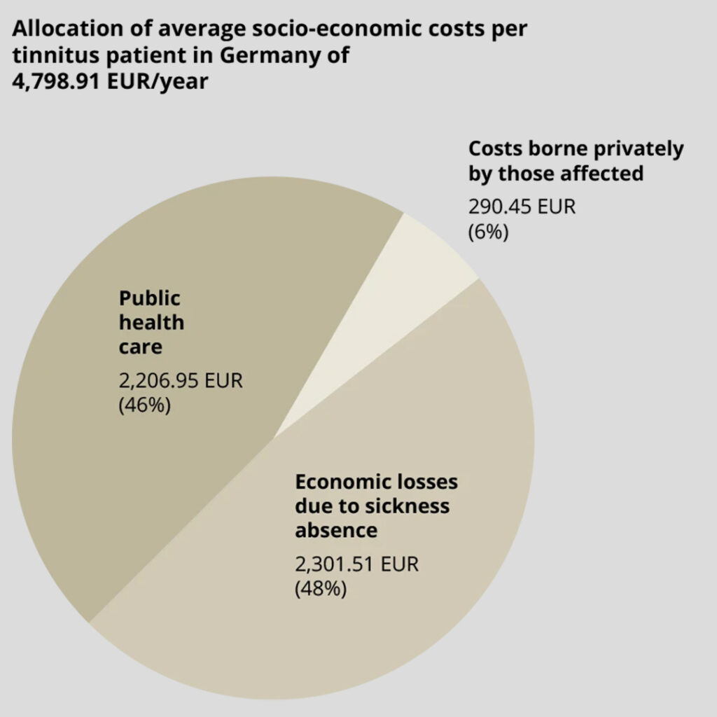 In addition, there are fatal economic consequences: The average socioeconomic costs per tinnitus patient:in in Germany amount to 4,798.91 euros per year. With a prevalence of 5.5%, this corresponds to 21.9 billion euros per year.