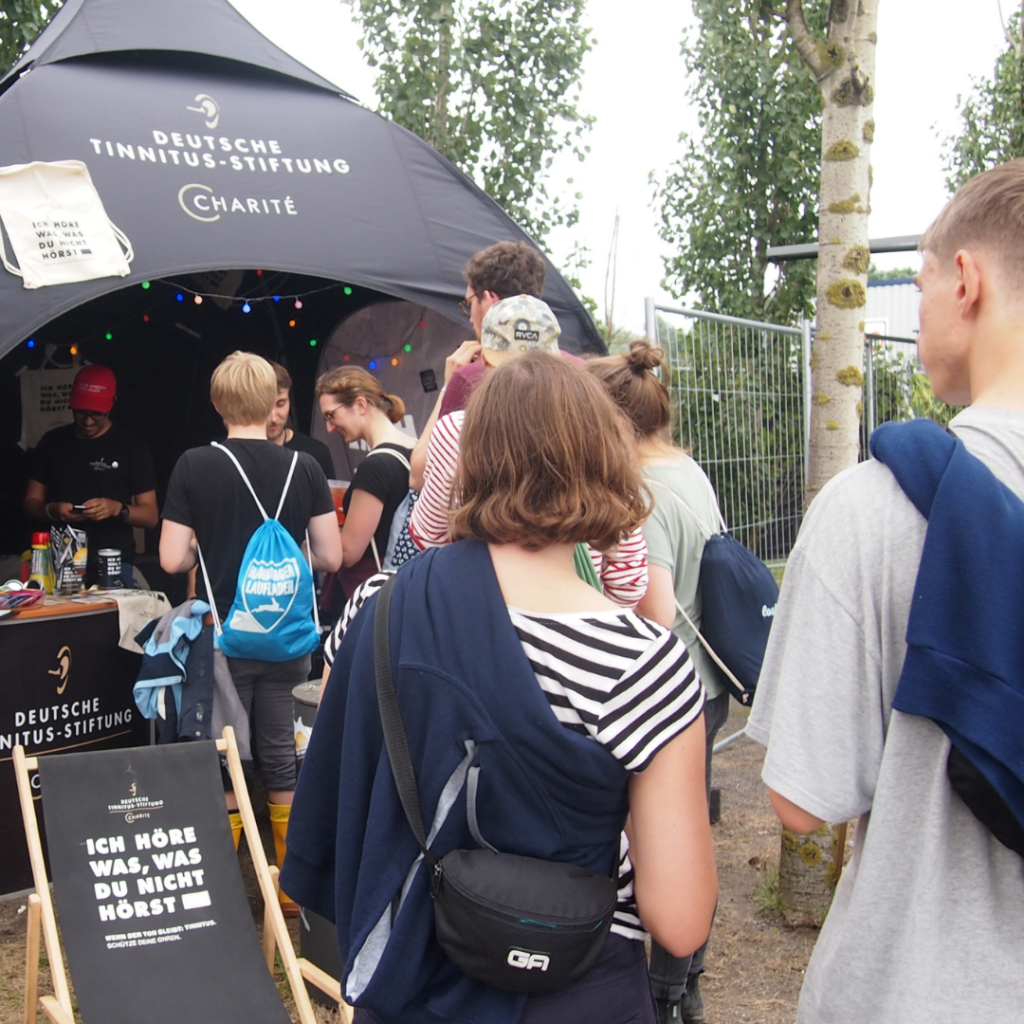 Tinnitus, once it has become chronic, or severe hearing loss cannot be cured; the only way to prevent it from developing is through prevention. That’s why, back in 2012, the Foundation developed the prevention campaign “I hear something you don’t: Tinnitus. Protect your ears”: Supported by 70 dedicated volunteers, it carried out active educational work directly in the risk situation until 2018: at major music festivals as well as at cultural and sporting events.