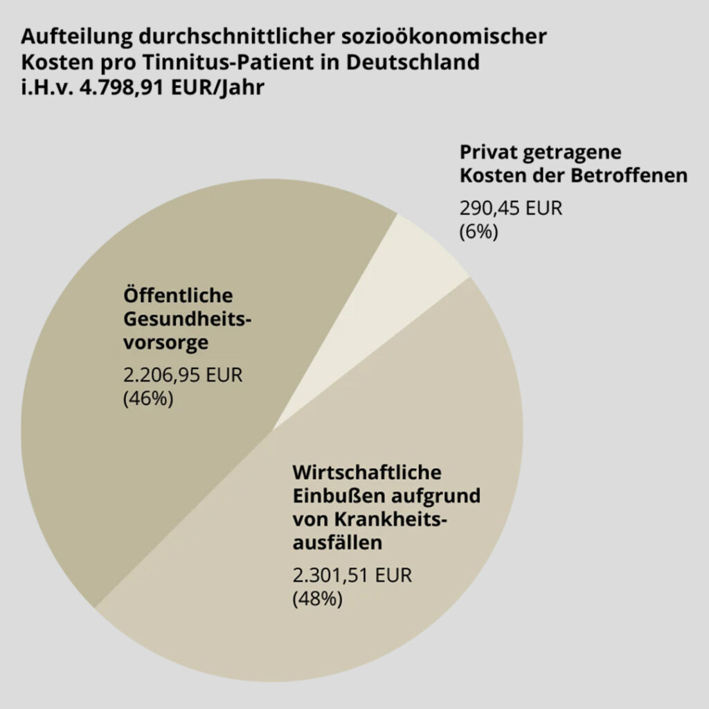 Hinzu kommen fatale wirtschaftliche Folgen: Die durchschnittlichen sozioökonomischen Kosten pro Tinnitus-Patient:in in Deutschland betragen 4.798,91 Euro pro Jahr. Bei einer Prävalenz von 5,5 % entspricht dies 21,9 Milliarden Euro pro Jahr.